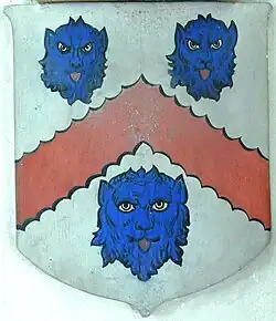 Anne Copleston (1588–1616), the heiress of Eggesford, married in 1605 Edward Chichester (1568–1648), later created Baron Chichester of Belfast and Viscount Chichester of Carickfergus. He was the second son[5] of Sir John Chichester (died 1569), of Raleigh, in the parish of Pilton, about 3/4 mile NE of the centre of Barnstaple, Devon,[6] by his wife Gertrude Courtenay (1521–1566), a daughter (by his 2nd marriage) of Sir William III Courtenay (1477–1535) "The Great",[7] of Powderham, MP for Devon 1529, Sheriff of Devon 1522, 1525-6, 1533-4 and Esquire of the Body to King Henry VIII,[8] a distant cousin of the Earl of Devon.[9] He was thus the younger brother of Arthur Chichester, Baron Chichester (1563-1624/5). Anne Copleston died in 1616 aged only 28, having produced at least three sons to continue the Chichester line. Edward married secondly Mary Denham, which marriage is recorded by a date-stone now set in the wall of Eggesford Barton inscribed "E.C.M. 1626". This may be the date on which Edward Chichester completed his rebuilding of the former mediaeval Eggesford House, which is evidenced by William Pole (died 1635) in his "Description of Devon" thus: "Edward Vi.cont Chichester of Cairfus which hath builded a fayre howse dwelleth nowe at Eggesford". Tristram Risdon's 1620 "Survey of Devonshire" furthermore records regarding Eggesford that Edward Lord Chichester "hath made a dainty dwelling thereof". During the Civil War Lord Chichester allowed this house to become a garrison for royalist troops, under the command of Lord Goring, whose HQ was at Tiverton. It was stormed on 18 December 1645 by the Roundhead Colonel John Okey with a regiment of Dragoons, as part of the final push by the parliamentary troops northwards from Exeter to their final victory at the Battle of Torrington in February 1646. About twelve prisoners were captured and taken back top Okey's base at Fulford House near Dunsford. No trace of this Chichester house remains but it is believed to have stood on a level site some 50 yards to the NW of the parish church, and was later rebuilt on the same site in 1718 by William Fellowes, whose building was demolished in 1824, leaving only a level area in the large field which exists there today. Edward and Anne's eldest son and heir was Arthur Chichester, 1st Earl of Donegall (1606–1674/5), who erected a very elaborate alabaster monument to his first two wives in Eggesford Church. Although he produced six sons by his second wife Mary Digby (1612–1648), daughter of John Digby, 1st Earl of Bristol, it was his daughter Mary by his first wife Dorcas Hill (died 1630), a daughter of John Hill of Honiley, Warwickshire, who inherited Eggesford. This seemingly arose through the terms of a marriage settlement, not preserved in the records, in which John Hill insisted the manor should descend to the children, male or female, of his daughter and son-in-law. Such terms in marriage settlements were not unusual.[10] Thus were the sons of the Earl excluded from this part of the Chichester lands.