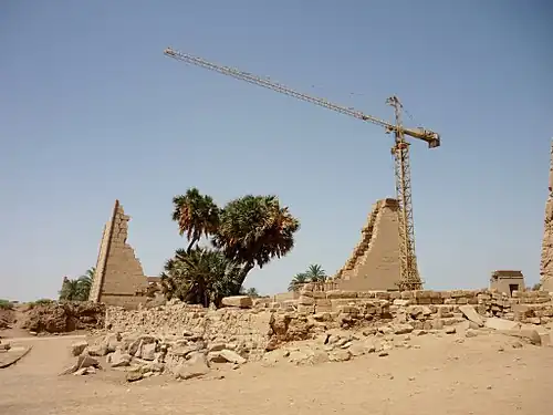 The use of stone in Egyptian temples emphasized their purpose as eternal houses for the gods and set them apart from buildings for the use of mortals, which were built of mudbrick.[88] Early temples were built of brick and other perishable materials, and most of the outlying buildings in temple enclosures remained brick-built throughout Egyptian history.[89] The main stones used in temple construction were limestone and sandstone, which are common in Egypt; stones that are harder and more difficult to carve, such as granite, were used in smaller amounts for individual elements like obelisks.[90] The stone might be quarried nearby or shipped on the Nile from quarries elsewhere.[91]
