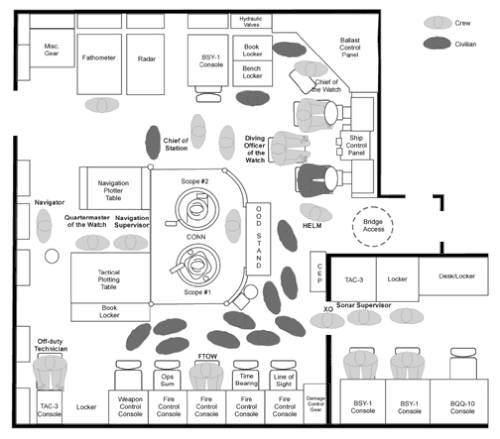 Before beginning the maneuvers, Waddle checked the submarine's sonar contacts and noted that there were several surface vessels in the vicinity, but none closer than seven nautical miles (13 km) away.[13] Ehime Maru was one of these vessels. The civilians were spread throughout the control room, with three on the periscope platform and others in front of the fire control station, restricting free access to some of the displays. According to several crewmembers, Waddle, when informed that equipment preparations would further delay the start of the demonstration maneuvers, "seemed frustrated that he couldn't start the maneuvers right away".[14]