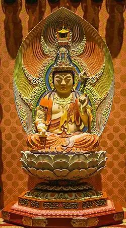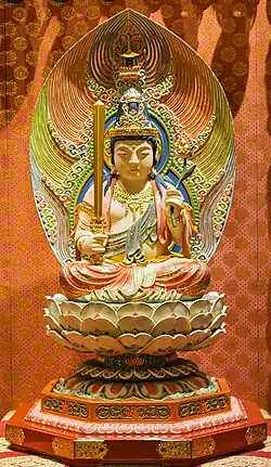 Eight Protectors of The Twelve Zodiac (Japanese: 十二支の御守り本尊[1]), also known as the The Eight Guardian Deities (Chinese: 八大守护神), Hachi-tai Futsu (Japanese: 八体仏), are guardian deities of the twelve zodiac animals in Japanese esoteric Buddhism, based on the Heavenly Stems, Earthly Branches, Twelve Nidānas and Godai.[2] Although they are called guardian deities, they are actually Yidams. According to Japanese Buddhist customs, each person born in the year of their birth is guarded by the Buddha or Bodhisattva corresponding to their zodiac sign. For example, the guardian deity of those born in the Year of the Rabbit is Manjushri.[3] Each guardian deity has a corresponding seed syllables, direction, and earthly branch.