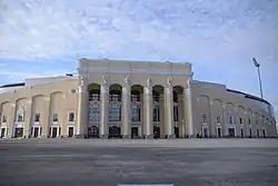 As the stadium was chosen as one of the venues of the 2018 FIFA World Cup, temporary stands extending outside the original perimeter of the stadium were erected to comply with FIFA's minimum capacity requirement of 35,000 spectators at the time.[10] The temporary seating also protects the historical façade of the monument of Stalinist neoclassicism. Following its removal, the seating was reduced to 35,000 seats.[11][12]