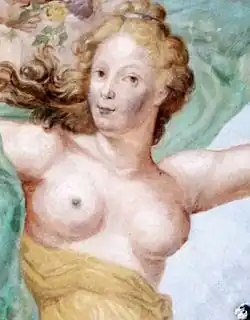 The conservation and enlargement of the former residence of Victorious King, John III Sobieski, is considered as her most significant achievement in the field of architecture. She embellished the palace facades and garden parterres with her coat of arms Szreniawa and monograms.[29] For the decoration of the palace's interiors she nominated an Italian fresco painter Giuseppe Rossi, who adorned the chambers with trompe-l'œil paintings and mythological plafonds. By taking the example of Queen Marie Casimire, that ordered to paint her as a goddess in palace plafonds, the hetmaness decorated the Lower Vestibule with a fresco depicting her as a Roman goddess of fertility – Flora (she was almost 60 at that time).[41]
