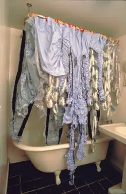 In her early career, Herzog aggressively reconfigured found linens, shower curtains, rugs, drapery and lace, smocking, puckering, cutting and stretching them into minimal sculptures.[34][26][35] This work alluded to the body, gender and women's undergarments, nature, cleanliness and privacy.[23][24][11] Her first textile work, Rapunzel (1990), featured a long, knotted piece of sheer fabric that hung below an altered, used wooden table and snaked along the floor;[20] in 1995, The New York Times likened her installation of elastic-ringed fabric pieces at the Islip Art Museum to a chamber colonized by caterpillars and candy-striped cocoons or pajamas gone berserk.[22] Reviews also identify Herzog's absurdist regard for the functionality and abjectness of the raw materials; The New Yorker described her 1998 P.P.O.W. show as "amusing, sophisticated formal objects whose poise belies their homely origins."[36][25][11]