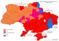 In the elections since 2002 voters of Western and Central Ukrainian oblasts voted mostly for parties (Our Ukraine, Batkivshchyna, UDAR, Self Reliance, Radical Party, Petro Poroshenko Bloc and the People's Front) and presidential candidates (Viktor Yushchenko, Yulia Tymoshenko) with a pro-Western and state reform platform, while voters in Southern and Eastern oblasts of Ukraine voted for parties (CPU, Party of Regions and Opposition Bloc) and presidential candidates (Viktor Yanukovych) with a pro-Russian and status quo platform.[22][23][24][25][26][27] Although this geographical division is decreasing.[28][22][29] Till the 2014 Ukrainian parliamentary election the electorate of CPU and Party of Regions was very loyal to them.[26] But in the 2014 parliamentary election Party of Regions did not to participate (because of a perceived lack of legitimacy (of the election), because not every resident of the Donbas could vote) and the CPU came 1.12% short of the 5% election threshold.[30][31] The results were a victory for the pro-Western parties and a major defeat for the pro-Russian camp.