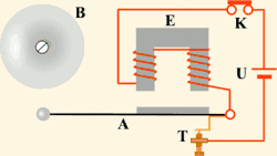 The most widely used form is the interrupter bell, which is a mechanical bell that produces a continuous sound when current is applied. See animation, above. The bell or gong (B), which is often in the shape of a cup or half-sphere, is struck by a spring-loaded arm (A) with a metal ball on the end called a clapper, actuated by an electromagnet (E). In its rest position the clapper is held away from the bell a short distance by its springy arm. When the switch (K) is closed, an electric current passes from the battery (U) through the winding of the electromagnet. It creates a magnetic field that attracts the iron arm of the clapper, pulling it over to give the bell a tap. This opens a pair of electrical contacts (T) attached to the clapper arm, interrupting the current to the electromagnet. The magnetic field of the electromagnet collapses, and the clapper springs away from the bell. This closes the contacts again, allowing the current to flow to the electromagnet again, so the magnet pulls the clapper over to strike the bell again. This cycle repeats rapidly, many times per second, resulting in a continuous ringing.