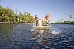 When boat electrofishing, the boat itself is the cathode, and the anode(s) are generally mounted off the bow.[2] The stunned fish swim toward the anode, where they are caught alive using a dip net.[3] Towed barge electrofishers operate similarly to backpack electrofishers, with the exception that the generator is located on a floating barge instead of on a backpack. Often the barge can be left stationary on the shore, while longer cathodes and anodes allow the crew to sample larger areas. Barge electrofishers often employ gas-powered generators since a user does not have to carry the extra weight on his or her back.