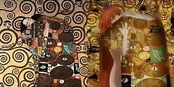 The opening and ending sequences feature artistic drawings of the principal characters. These characters are drawn in a style based on Gustav Klimt's paintings, including The Kiss, Adele Bloch-Bauer I, and others with similar imitating poses, colors, and patterns.[12] In promotional art as well as in the series itself, characters make use of a famous El Greco hand symbol of outstretched fingers with the middle and ring fingers connected. The song Elfenlied ("Elf Song") appears in the manga[13] and is credited to the composer Hugo Wolf. A poem by Eduard Mörike is the basis for Wolf's version. It is taught to Nyu by the manga-only protagonist Nozomi. In the manga, the Diclonius are kept in a grotto called the Lebensborn Cave, a reference to the Nazi eugenics program.[14]