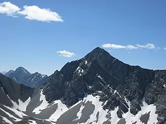 The Elk Range is a mountain range of the Canadian Rockies, located on the southern edge of Kananaskis on the Alberta-British Columbia border. The range was named for elk found on the mountain slopes and in the nearby Elk River valley. Originally known as the Elk Mountains in 1917, the name was formally changed to the Elk Range in 1951.[4]