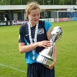 In July 2010, White returned to Arsenal after five years away, following the break up of the Leeds squad due to a funding crisis.[18] During her time at Arsenal with manager Laura Harvey, they won three league titles and two FA Cups.[19] During the 2011 season, she scored six goals in thirteen appearances for the club.[20] Her first goal was a game-opener in the 40th minute of a 2–1 loss to Birmingham City.[20] Arsenal finished first in the league with a 10–2–2 record.[21] White's six goals ranked fourth highest in the league and second highest on the team.[21] The same year, she helped the club win the 2011 FA WSL Cup and 2010–11 FA Women's Cup.[20] During the semi-final of the 2010–11 FA Women's Cup, she scored a hat-trick lifting Arsenal to a 5–0 win over Barnet and berth to the final where they defeated Bristol Academy 2–0.[22][23]