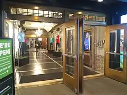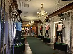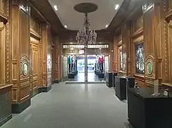 Two sets of double doors lead from the entrance to the outer lobby. Each door is made of bronze with 20 glass panes; a transom window runs above the doors. The outer lobby's floor consists of black tile squares, separated by a grid of white marble.[8] The space includes veined marble walls[8][9] with wainscoting and illuminated sign displays.[8][10] As of 2019, the walls contain freestanding and wall-mounted truss structures[10] with displays of sport wear.[3] A plasterwork frieze, containing motifs of medallions and swags, runs at the top of the walls. The coved ceiling is surrounded by a molded band and contains two overhanging brass-and-crystal chandeliers, as well as ceiling vents for air conditioning. The outer and inner lobbies are separated by two brass-and-glass double doors, similar to those between the entrance and the outer lobby.[8]
