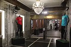 The former auditorium is accessed from the inner lobby and was designed with a single level of seating. There was neither a balcony nor boxes.[5][13][15] Originally, the auditorium had 598 seats,[17][18] later cited as 582.[19] The original seats contained tapestry coverings; lacquered carmine-colored arms; and lacquered black-and-gold seat backs.[14] Aisles ran along each side of the auditorium.[9] The room has a slightly raked floor that slopes down toward the proscenium arch on the east wall.[20] The Pele Soccer store's floor is largely a flat surface placed on footings above the raked floor, which is still extant.[21] The store's raised floor is designed to resemble a soccer field.[3][22] To the north and south of the raised floor are ramps that are actually part of the original raked floor.[21]