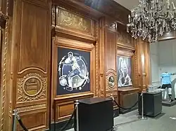 The east wall of the auditorium contains the proscenium arch.[30] In front of the arch, there was originally a stage measuring about 4 feet (1.2 m) deep, as well as an orchestra pit and a motion-picture screen.[30] The screen was removed in 1997 and replaced with a mural by artist Jessica Daryl Winer. Entitled Curtain Call, the mural depicted 200 notable Broadway personalities.[18][31][32] The modern Pele Soccer store has an LED display within the proscenium opening, measuring 13 feet 2 inches (4.01 m) tall by about 22 feet (6.7 m) wide.[33]