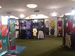 In November 2019, a Pelé Soccer store opened within the former Embassy Theatre space.[3][22] Prior to the store's opening, the marquee above the theater's entrance was modified with the store's name. Television screens were installed in the theater's entrance vestibule, displaying soccer games, and the outer and inner lobbies were arranged with soccer memorabilia. The auditorium itself was used sell to soccer gear and footwear, and the auditorium floor was modified to look like a soccer field.[3]