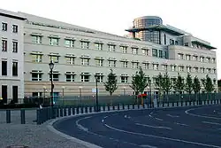 The U.S. Mission to Berlin was housed in a building that was part of a series of structures that formed the former headquarters of the Luftwaffe for Berlin defense during the Nazi years. This complex became the headquarters of the Berlin Brigade, part of the United States Army Berlin command in Berlin during the Cold War years. On the end of some of these buildings were Nazi ornamentations. The purely Nazi symbols were removed, but large cement eagles can still be seen at the corners of some of the buildings (including the one to be used by U.S. Mission Berlin) minus the swastikas that used to be below their feet.