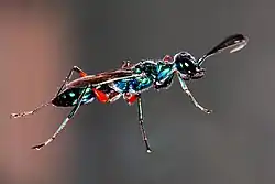 The emerald cockroach wasp or jewel wasp (Ampulex compressa) is a solitary wasp of the family Ampulicidae. It is known for its unusual reproductive behavior, which involves stinging a cockroach and using it as a host for its larvae. It thus belongs to the entomophagous parasites.