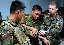 - ^ a b c Kragh JF, O'Neill ML, Walters TJ, Dubick MA, Baer DG, Wade CE, et al. (October 2011). "The military emergency tourniquet program's lessons learned with devices and designs". Military Medicine. 176 (10). Association of Military Surgeons of the U.S.: 1144–1152. doi:10.7205/milmed-d-11-00114. PMID 22128650.