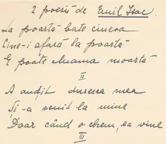 Emil Isac's work was published in several new editions during the decades after his death. Such volumes enlisted contributions from several authors and critics of the day: Ion Brad, Veronica Porumbacu, György Rába, Elemér Jancsó, Mircea Zaciu, Mircea Tomuş, Ion Oarcăsu, Leon Baconsky, Dumitru Micu, Constantin Ciopraga etc.[5] His contributions were gathered into a definitive Hungarian-language translation, printed in Bucharest in 1962, while his correspondence with Hungarian intellectuals was issued as Hungarian-language magazines and separate volumes, in both Romania and Hungary.[35] His various poems were included into several anthologies of Romanian poetry, or published individually, in Argentina, Belgium, Brazil, France, Greece, Hungary, Italy, the Soviet Union (Russian SFSR, Armenian SSR), and the United Kingdom.[21]