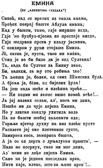 - ^ Aleksa Šantić (1902). Danilo A. Živaljević (ed.). "Емина" [Emina]. Kolo (in Serbian). 4 (3–4). Belgrade: Štamparija Petra Ćurčića: 134.