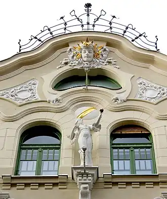 The building, designed in the French Art Nouveau style by the chief architect of Timișoara at the time, László Székely, attracts through the compositional coherence of the facade. The leitmotif of the sinuous line generates every register of the facade, from the outline of the pediments to the window frames and to the details of the ironmongery of the access gate.[1] The facade has three parts, the higher sides with three windows in the upper part and the middle part, lower, with four windows per floor and a statue is also located on the top floor.[5] The central motif of a woman's face, often found in Timișoara's plastic from the beginning of the 20th century, is also noticeable at the Emmer Palace.[1] Great attention was also paid to the interior of the building, with a richly decorated niche in the stairwell.[6]