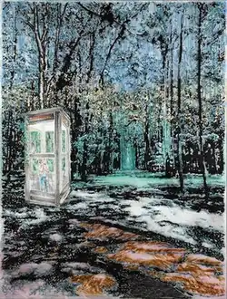 Swansea often combines images in selections that eschew fixed meaning, with topical and cultural references. The fraught history of the American south, including gay and civil rights, are frequent topics, along with landscape and maritime images. Subjects are revisited over many years in a discursive examination of the contemporary world, including paintings of the Macy’s Day Parade and the first Nascar racetrack in North Carolina,[10] still extant but now abandoned in a pine forest.[11] In the painting area code from 2019, the depiction of a phone booth feels like a relic from the past in the age of cellular phones. Meticulously creating her images by hand, with each brushstroke visible, the painting subverts a mass movement towards digitization.[12]