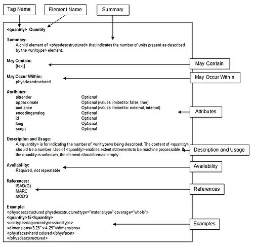 - ^ a b Pitti, Daniel V. (2009), "Encoded Archival Description (EAD)", Encyclopedia of Library and Information Sciences, Third Edition, CRC Press, pp. 1699–1707, doi:10.1081/e-elis3-120044047, ISBN 9780849397127