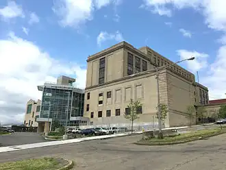 The Connelley Trade School sits on a 3.56 acre site in the Hill District/Crawford–Roberts & Uptown/Uptown, Pittsburgh neighborhood of Pittsburgh, Pennsylvania. The 172,152 square foot Classical Revival and Art Deco structure was designed by architect Edward B. Lee with builder J.G. Fullman and realized in steel, and clad in brownstone, with brick throughout and an asphalt roof.[16] The academic block housed a cafeteria, gymnasium, auditorium and swimming pool (below ground) - features shared by countless other educational institutions built or added to during the 1920s. By contrast, the shop building, which sits behind the academic block and faces the downtown business district to the north-west, is marked by a distinctive saw-toothed roof. According to a brief history of the school, compiled by an instructor in the Mathematics and Physics department and published in 1960, the total cost came to $1,754,096.38.[17]