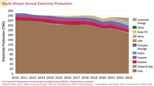 South Africa is planning to shift away from coal in the electricity sector, and the country produces the most solar and wind energy by terawatt-hours in Africa.[3] The country aims to decommission 34 GW of coal-fired power capacity by 2050.[2]