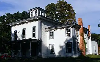 The Engelbert B. Born House is a two-story, L-shaped, frame Italianate structure on a masonry foundation. It is sided with clapboard and has paneled pilasters on the corners. The low-pitched hipped roof widely overhangs the walls, and has a cupola at the top.[2]