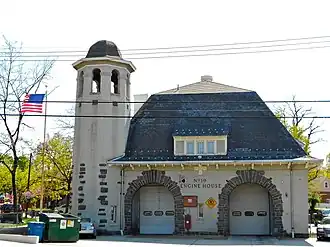 The first fire station east of the Anacostia River was built in 1898. This station, designed by the Washington, D.C. architectural firm of Averill and Adams, was the fourth built there in 1910. The eclectic style, principally French revival, reflected the desire by the Office of the Municipal Architect to create unique designs for new fire stations.[2] At the time, this part of the District of Columbia was considered a suburban district because it was beyond public water service and the street alarm system. Chemical Company Number 2 was housed here for that reason. The building's hose tower was also used as a lookout post. It joined with the last of the District's Chemical companies in being converted to a regular engine company on January 1, 1921 when it became Engine Company 19.[3] In 1925 it was the last company in the department to switch from horse drawn apparatus to motorized.
