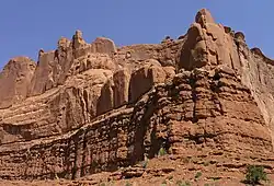 The Entrada Sandstone is a formation in the San Rafael Group found in the U.S. states of Wyoming, Colorado, northwest New Mexico, northeast Arizona, and southeast Utah. Part of the Colorado Plateau, this formation was deposited during the Jurassic Period sometime between 180 and 140 million years ago in various environments, including tidal mudflats, beaches, and sand dunes.[1] The Middle Jurassic San Rafael Group was dominantly deposited as ergs (sand seas) in a desert environment around the shallow Sundance Sea.[2][3]