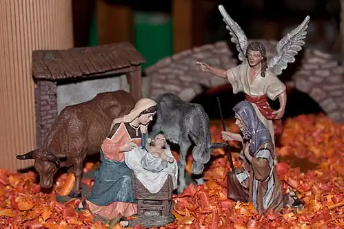 The supposed presence of the two animals at the birth of Jesus may have its origin in the Book of Isaiah chapter 1 verse 3: "The ox knoweth his owner, and the ass his master's crib: but Israel doth not know, my people doth not consider."[2]