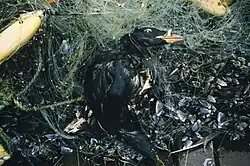 Recent research has shown that, by mass, fishing debris, such as buoys, lines, and nets, account for more than two-thirds of large plastic debris found in the oceans.[47] In the Great Pacific Garbage Patch, fishing nets alone comprise at least 46% of the debris.[48] Similarly, fishing debris has been shown to be a major source of plastic debris found on the shores of Korea.[49] Marine life interacts with debris in two ways: either through entanglement (where debris entangles or entraps animals), or ingestion of the debris (either intentionally or accidentally).[50] Both are harmful to the animal.[50] Marine debris consisting of old fishing nets or trawls can often be linked to phenomena such as ghost fishing, wherein the netting debris, referred to as ghost nets, continues to entangle and capture fish.[51] A study performed in southern Japan on octopuses noted that there was an estimated mortality rate of 212,000–505,000 octopuses per year within the area's fishing grounds, due in large part to ghost fishing.[52] Tracking garbage and monitoring the logistics of human waste disposal, especially waste materials primarily associated with fishing, is one method to reduce marine debris.[51][53] Using technological or mechanical innovations such as marine debris-clearing drones can further serve to reduce the amount of debris within oceans.[51][53]