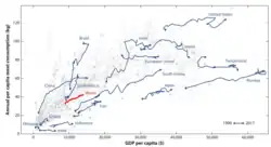 Multiple studies have found that increases in meat consumption are currently associated with human population growth and rising individual incomes or GDP, and therefore, the environmental impacts of meat production and consumption will increase unless current behaviours change.[8][9][10][5]
