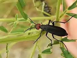 Adults feed on leaves and flowers of various herbaceous plants, whereas larvae feed on Acrididae eggs.[2]