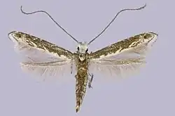 The wingspan is 8.3–10 mm. The forewings are brown with a narrow white band on the dorsum from the base to 2/3 of the entire length and with three narrow white bands beginning at the dorsal margin near 1/2 to 3/4 length of the wing and extending obliquely toward the wing apex, terminating before reaching mid-width of the wing. Dull white spots are scattered on the costal half and there is a narrow silver band with metallic reflection extending from the costa to the dorsum at 5/6 length. The distal 1/6 is orange-brown with a black dot centrally, franked by a short white band near the dorsum. The distal end is fringed with a narrow white band. The hindwings are brown.