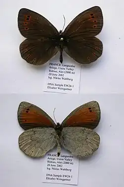 Erebia sthennyo, the false dewy ringlet, is a member of the subfamily Satyrinae of the family Nymphalidae.[1] It is found in the Pyrenees in Spain and France. In Spain it is found in the central Pyrenees in Puerto de Portalet, Monte Perdido and Puerto de Benasque, in France it is found from Pic du Midi d'Ossau to Pic du Midi de Bigorre and Luchon, as well as from Port de Salau to Andorra. It is found at heights from 1,800 meters upwards.