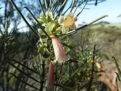 The flowers are borne singly or in groups of up to 4 in leaf axils on hairy stalks 3–10.5 mm (0.1–0.4 in) long. There are 5 hairy, spoon-shaped to lance-shaped sepals which are mostly 7–18 mm (0.3–0.7 in) long and which are cream-coloured or brown. The petals are mostly 20–30 mm (0.8–1 in) long and are joined at their lower end to form a tube. The petal tube is cream-coloured with a pink tinge, pink, red or (rarely) maroon. The tube and its lobes are glabrous apart from the margins of the lobes, and the inside of the tube which is hairy. The 4 stamens extend slightly beyond the end of the petal tube. Flowering occurs from winter to early summer[3] and the fruits which follow are oval to cylindrical in shape and 4–7 mm (0.2–0.3 in) long.[2][3][4][5]