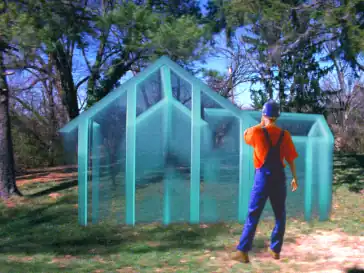 The films are noted for their complex use of layering as a compositional principle.[35][30][36] Beckman superimposes images, uses plays on words to create double meanings, and juxtaposes a bright, pop-art aesthetic with psychologically dark underlying themes in a manner that ARTnews described as "cheery but biting."[7][30][14][1] Rhythmic temporal patterns are prominent in the work's sound and pacing, repetitive actions and chanting in concert with a kinetic, nonlinear style of editing.[1][36] Much of the work is filmed in black box-style theaters, which lends itself to superimposition and allows for scenes that lack a horizon line, suggesting representational ambiguity.[12][37]