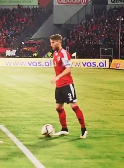 He made his debut for Albania on 15 November 2013 in a friendly match, the first one after the end of the qualification campaign against Belarus playing the full 90 minutes match, which finished in a 0–0 draw.[34][35] He received another call up for the next friendly match on 5 March 2014 against Malta.[36]