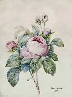 She described herself as a 'translator of Goethe's poems, pupil of Redouté and designer of Chaumeton's "Flore Médicale"', published by her husband Charles Louis Fleury Panckoucke (1780-1844). She illustrated this work with Pierre Jean François Turpin (1775-1840). She is thought to have met Redouté at either the Château de Malmaison whilst a student under Prud'hon, or at Jean-Baptiste Isabey's studio while sitting for a portrait. Afterwards she regularly attended Redoute's classes at the Jardin des Plantes. Redouté had been commissioned by Empress Joséphine to depict the roses and lilies at Malmaison.