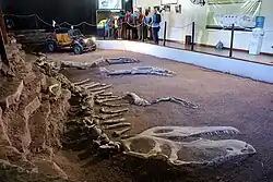 The museum of Villa El Chocón was created as a consequence of paleontological findings of great scientific importance in the Exequiel Ramos Mexía Dam. Its most important exhibit is a carnivorous dinosaur of great dimensions, G. carolinii. In addition, other species of dinosaurs and vertebrates have been found and/or studied, such as Neuquensaurus australis, Amargasaurus cazaui, Bajadasaurus pronuspinax,[7] the remains of an unspecified member of the Titanosauria, Skorpiovenator bustingorryi,[8] the remains of Choconsaurus baileywillisi[9] (caudal and dorsal vertebrae, and the original metacarpal bones and maxillae), Prochelidella sp., Kaikafilusaurus calvoi and Avitabatrachus uliana, among others.