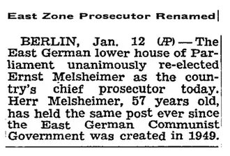 - ^ Sabina Lietzmann [in German] (5 April 1956). "Ernst Melsheimer - Ein deutscher Wyschinski: Nach Kriegsende trat Melsheimer sofort der KPD bei. ... 1946 wurde er Vizepräsident der Zentralverwaltung für Justiz und 1949 Generalstaatsanwalt der DDR". Die Zeit. Die Zeit (online). Retrieved 26 October 2014.