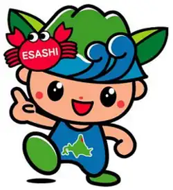 Esashi's mascot is Esashi-kun (えさっしー). He is a bright and energetic fairy who loves the forest and the sea and the taste of the horsehair crab. As such, he customized his hat with the things he likes. He is unveiled in 2011. He is created by Ayumi Shozaki of Osaka.[16][17]