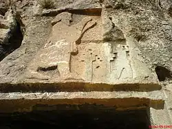 The Essaqwand Rock Tombs (Persian: گوردخمه اسحاقوند) are three rock-hewn tombs located 25 km southwest of Harsin in Kermanshah province, Iran. On top of the middle tomb there is a rock relief of a man with his profile toward the viewers. He is holding his hands in prayers in front of him. There is also a torch and a fire altar in front of him. Behind the fire altar there is another man, holding up something in his hands. The tombs have been attributed to different historical eras including Medes, Achaemenids, Seleucids and Parthians.[1]