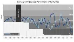 In English football, the Essex derby is the local derby between the two professional teams in the English county of Essex – Colchester United and Southend United. The first Essex derby match that took place was a 4–2 victory for Southend in a Third Division South tie on 14 October 1950. The derby has been contested in four different competitions, with Southend winning 34 of the games, Colchester winning 31 and 17 have been drawn.