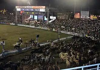 The amphitheater consists of a pitch (used for jineteada gaucha or rodeos), and a stage. It was named after José Hernández,[5] author of the epic poem Martín Fierro, the pinnacle work of gauchesco literary genere.[6][7][8] Hernández is regarded as one of the most important Argentine writers of all time.[9]