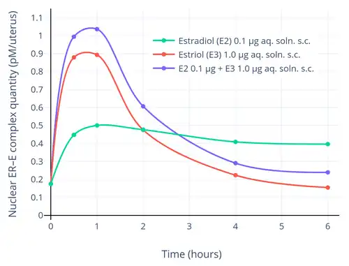 The weak and atypical estrogenicity of estriol is thought to be related to its short duration in the body and hence the fact that it stays bound to the ER for a relatively short amount of time.[4][21] Whereas estradiol remains bound to the ER for 6 to 24 hours with a single short-acting injection, estriol dissociates from the receptor much more rapidly and stays bound for only 1 to 6 hours.[4][21][58][59] As a result, estriol can only induce estrogenic effects which require short-term interaction with the ERs.[4][21] Induction of endometrial mitoses requires the ligand to remain bound for at least 9 to 12 hours, and this is thought to be responsible for the lack of endometrial proliferation with estriol in many studies.[4][21] If estriol is delivered more continuously than a single administration per day however, for instance if it is given as a subcutaneous pellet, as a depot injection, or in multiple doses two or three times per day, this results in more sustained exposure to estriol and full estrogenic responses equivalent to those of estradiol occur.[4][21][12] For these reasons, estriol has been described as a "short-acting" estrogen and it has been said that descriptors like "weak" and "impeded" are inaccurate.[21] Consumption of food after oral administration of estriol also results in more prolonged exposure to estriol, due to enterohepatic recycling and resurgences in estriol levels.[4] As such, if avoidance of endometrial hyperplasia or other full estrogenic effects is intended, it may be preferable to take estriol in a single dose, as low as possible, once per day at night before bedtime.[4][52]