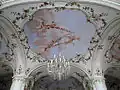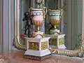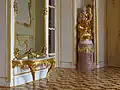 Eszterháza was first inhabited in 1766, but construction continued for many years. The opera house was completed in 1768 (the first performance was of Joseph Haydn's opera Lo speziale), the marionette theater in 1773.[1] Joseph Haydn's concerts typically took place in the Sala Terrena on the ground floor, in the picture gallery, where on May 30, 1781, a concert was performed in the presence of Prince Albert Casimir, Duke of Teschen and his spouse, Archduchess Maria Christina of Austria, daughter of the Empress Maria Theresa.[1] Musical entertainment for the higher ranks was provided in the main building, typically located in the picture gallery ground floor. Regular free-to-attend academies were typically held in the marionette theater, which were open to the public and hosting a whole range of cultural and environmental programmes.[1] The fountain in front of the palace was not completed until 1784, at which point the Prince considered his project complete.[1] The music room was decorated with white and gold walls with delicately rounded corners, the frescoed ceiling, glass chandeliers, roses, and audience's period chairs.