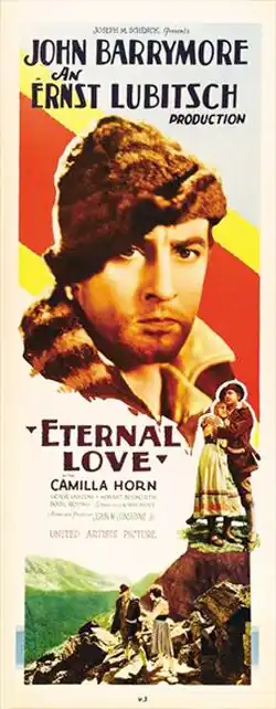 Eternal Love is a 1929 American sound romantic drama film directed by Ernst Lubitsch and starring John Barrymore and Camilla Horn.[2] While the film has no audible dialog, it was released with a synchronized musical score with sound effects using both the sound-on-disc and sound-on-film process. Based on the novel Der Koenig der Bernina by Jakob Christoph Heer, the film is about two lovers living in the Swiss Alps who struggle to be together and escape their loveless marriages. Eternal Love was the last silent film for both Lubitsch and Barrymore.[3][4]