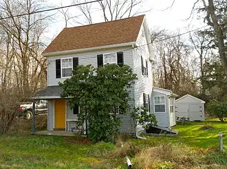It is a wooden frame two-story, two-bay house with gabled roof which had a small enclosed front porch. Photographs taken in 1970 or 1979[3] show a simple building with wooden siding, a tin roof, six-over-six windows, and an interior chimney on the south end. The single decorative item appears to be a "gothic" attic window with a "pointed arch" above a rectangular window. A photograph from 2011 shows that the roof, siding and windows have been recently replaced, the porch opened up, and the chimney removed.